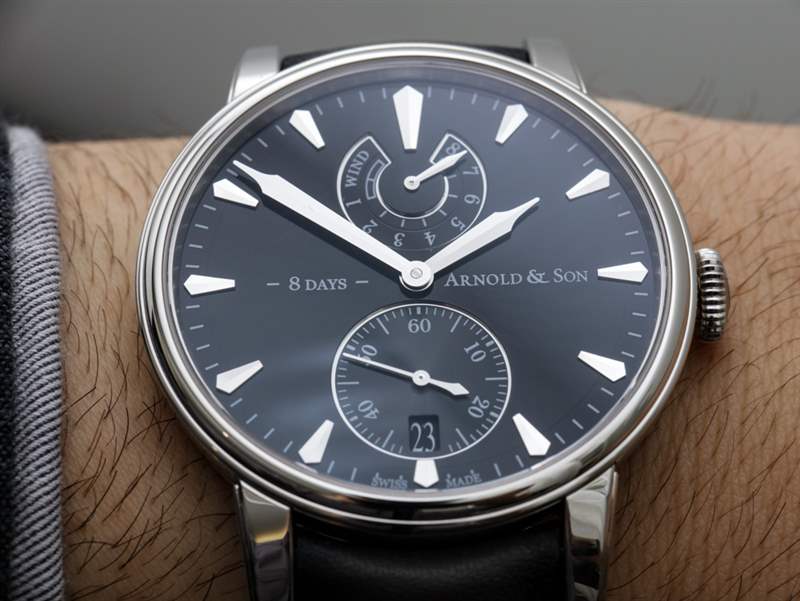 表盤上的易讀性和性感性很高,在我看來,這些表盤恰到好處地融合了優雅和精致,并且有吸引注意力的趨勢。堅固而傳統的指針增添了陽剛之氣,Arnold & Son 甚至能夠在組合中插入日期指示器窗口(在輔助秒盤中)。