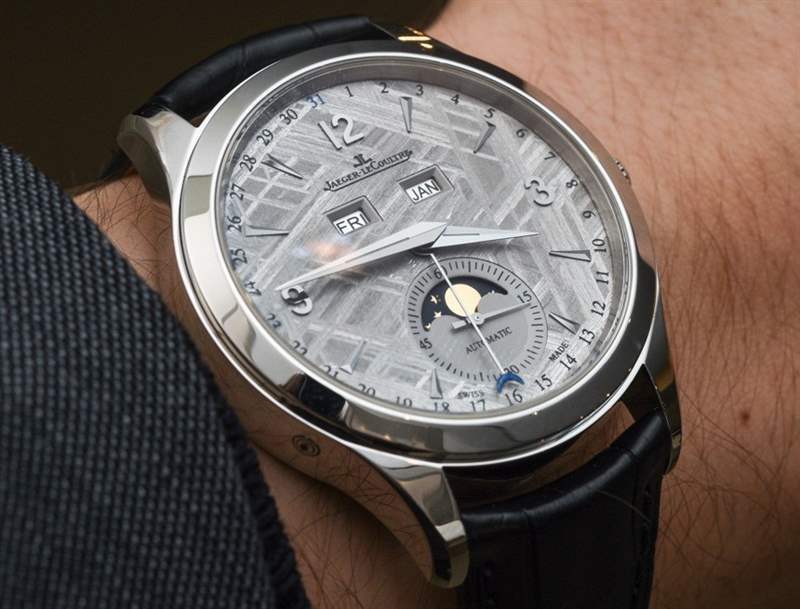 當然,積家也推出了無隕石表盤的精鋼或18k玫瑰金萬年歷腕表,搭配鍍銀表盤。那些看起來不錯,但隕石增加了視覺趣味,使時計更加獨特,在我看來,引人注目。一個合理的問題是“隕石表盤的溢價是多少?” 任一版本的答案都是 2,300 美元。因此,從標準的鍍銀表盤 Master Calendar 到 Jaeger-LeCoultre Master Calendar Meteorite 的成本要高得多。合理的價格?它并不便宜,但我想在隕石上打印更復雜,就像應用指示器和切割它一樣。最重要的是,隕石是一種稀有礦物,因此它的價格當然會高于標準金屬表盤。