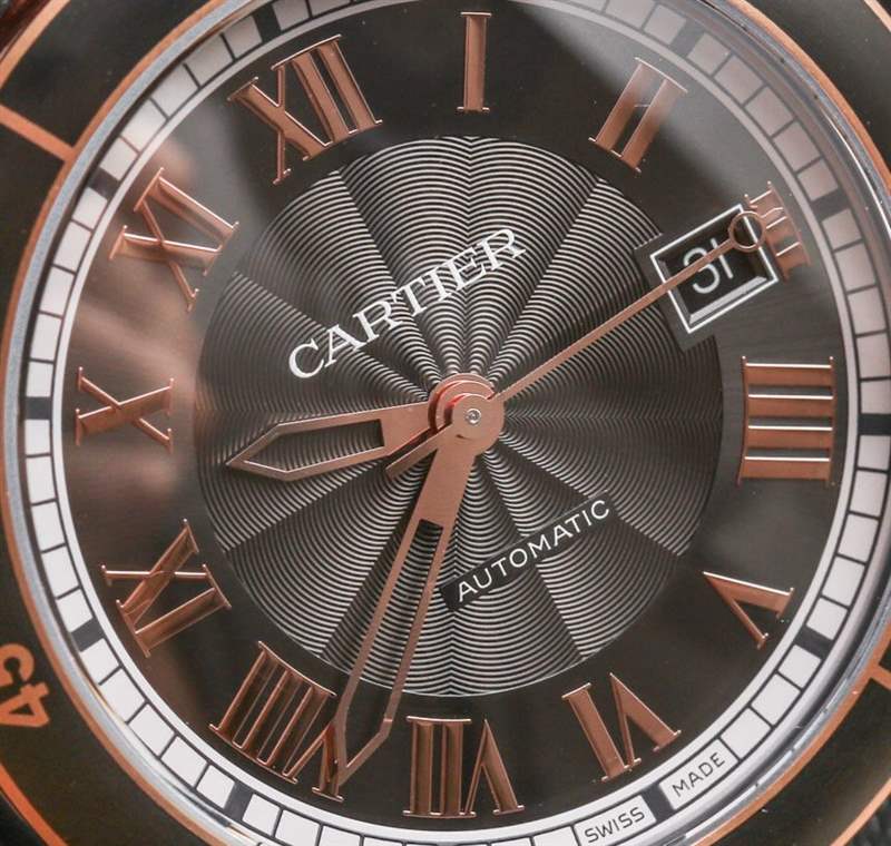 Cartier Ronde Croisiere 的表圈設計看起來像旋轉的潛水員表圈,但它是固定的。精鋼表圈采用 ADLC 黑色啞光涂層,賦予其獨特的外觀。這在鋼和金型號上非常有效,在表圈和 18k 玫瑰金表冠上增加了一些 18k 玫瑰金鍍層。黑色尖晶石用作表冠的凸圓形材料,與許多其他卡地亞手表更常見的藍色藍寶石水晶形成鮮明對比。皇冠非常符合卡地亞設計 DNA 的范圍。