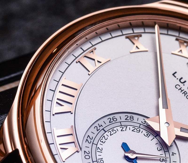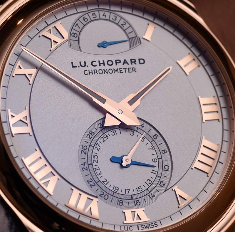 蕭邦 LUC Quattro 表盤上的時間指針為金色,與表殼材料顏色相匹配。動力儲存指示器和日期的指針是藍色的——這是一種很好的增色方式,可以幫助人們避免與指針混淆。表盤有輕微的深度,包括各種級別以及應用的指示器。平面表盤是任何高端外觀的敵人,更多的手表制造商知道這一點。我覺得蕭邦對 LUC Quattro 表盤的處理非常成功,盡管設計試圖稍微前衛(從藝術角度來看,這在一天結束時往往是一件好事)。