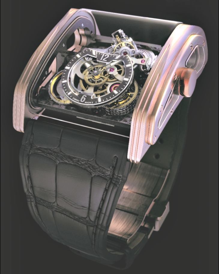 藍寶石水晶實際上是一根管子,顯然是手工加工和完成的。這意味著它用兩個金屬端點環繞整個外殼。它無疑構成了一個有趣且獨特的案例結構。對于手表,您還可以選擇由鱷魚皮、小牛皮、野豬皮或橡膠等材料制成的表帶。當然,您會得到一個與之配套的手工制作的盒子——這在如此依賴手工勞動的限量生產時計上很常見。
