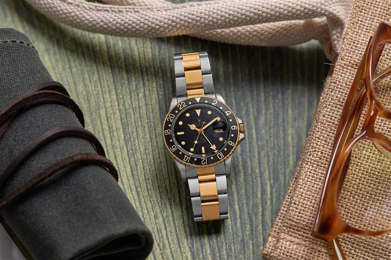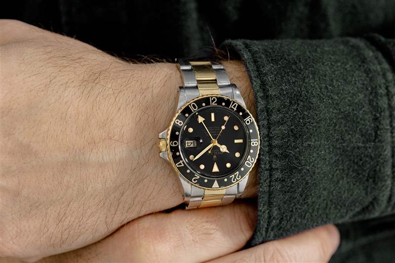 一個星期五,下午6點15分,寫這篇文章的時候,我的內心有些糾結:我喜歡這只表嗎?我又回到了我的雙色手表難題:它不完全是金,也不完全是鋼,感覺它試圖成為一切,但又不完全。在我看來,尤其是雙音 GMT,因為多年來我一直在導師的手腕上看到它;本能地,它最好屬于一位紳士的手腕,他贏得了自信,可以毫不費力地穿上一件帶有金色紐扣的雙排扣海軍藍色夾克。不知怎的,我覺得我還沒有資格戴這塊表。但是在看了這個例子并長時間停頓之后(是的,我有想得太多的傾向),我決定是時候回過頭來擁抱這個半金半鋼的創作了。我喜歡表盤上有簽名“1986 年勞力士 GMT-Master Ref.?蒂芙尼 (Tiffany & Co) 零售的 16753 雙色調
