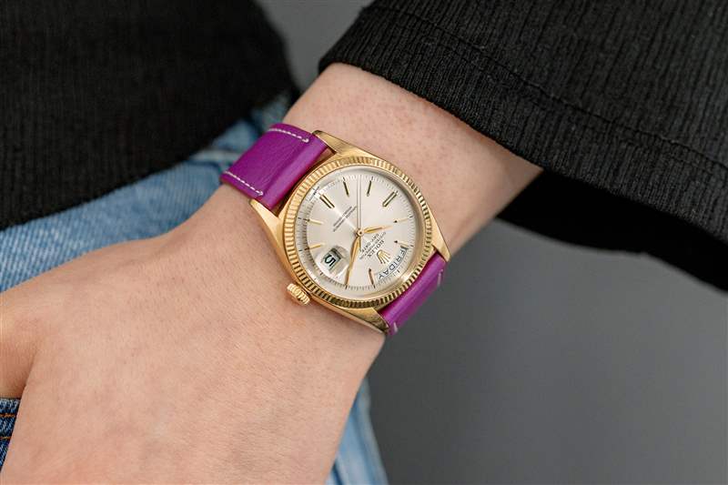 幾十年來星期日歷型并沒有太大變化;這在我的書中得分。如果你說一口流利的復古勞力士,這里有一些線索可以指出這個星期日歷型的日期有多早(1961 年)。第一個更明顯——阿爾法手。這種風格是您在 1950 年代結束的古董勞力士手表的“泡泡背”時代發現的那些風格的遺留物,因為其中許多參考具有相似形狀的指針。知道了這一點,我們的例子開始顯示它的年齡,同時在 2022 年看起來并不格格不入。此外,這款手表的表盤沒有采用常見的勞力士旭日紋飾面,直線從中央小齒輪延伸到表盤邊緣;我們的表盤采用同心圓飾面。圓圈從中心發出并遠離中心,1961 年勞力士 Day-Date Ref.?1803