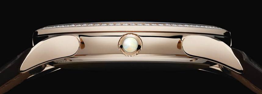 Parmigiani Tonda 1950 Squelette 女式腕表還搭載鏤空 PF705 機(jī)芯,配有有趣的磨砂藍(lán)寶石水晶表盤(pán),可以看到機(jī)芯,但方式更加柔和。39 毫米寬的男士款采用 18k 白金表殼,女士款則采用 18k 玫瑰金表殼,表圈鑲嵌 84 顆鉆石(約 0.646 克拉)。