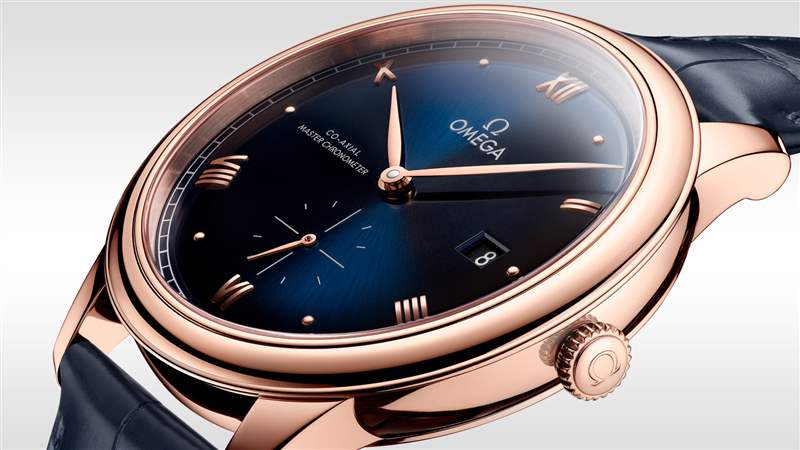 與之對(duì)應(yīng)的男表選擇頗多,比如碟飛系列第三代典雅腕表41毫米,由偏紅的 Sedna 18K金制成。這是一種呈現(xiàn)熾烈色調(diào)的18K玫瑰金,同樣由歐米茄獨(dú)家研發(fā)制造,其獨(dú)特成分包括銅和鈀,以確保顏色持久和穩(wěn)定。這一新型合金的名稱源于被天文學(xué)家稱為 Sedna 的外海王星天體,Sedna 小行星被認(rèn)為是太陽(yáng)系中表面顏色最紅的天體之一。拱形的深藍(lán)色 PVD 表盤呈現(xiàn)出太陽(yáng)射線的打磨效果,柳葉形時(shí)分指針及6點(diǎn)位的小秒針經(jīng) Sedna 18K 金 PVD 處理,羅馬數(shù)字刻度和弧面形小時(shí)刻度交替出現(xiàn),特別文質(zhì)彬彬。