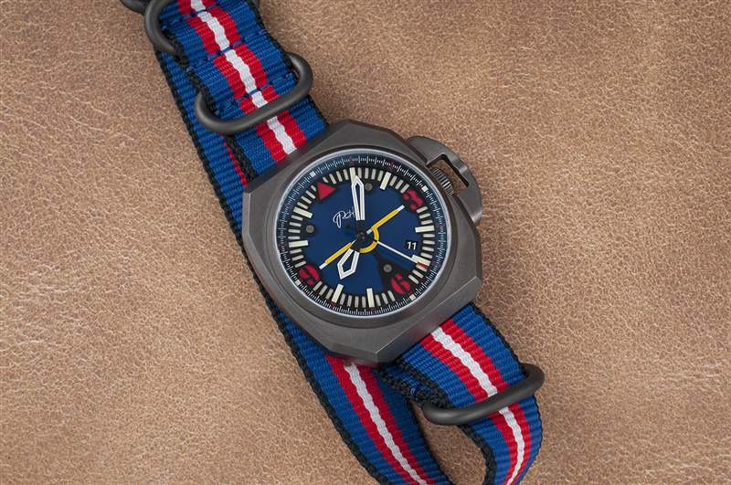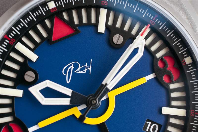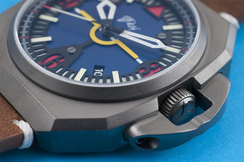 復(fù)雜的刻度環(huán)(由三顆可見(jiàn)螺釘固定)在四分之一處設(shè)有軍事風(fēng)格的數(shù)字,而 12 點(diǎn)鐘處的三角形則向更傳統(tǒng)的飛行員手表致敬。其上方的改造具有額外的標(biāo)記,包括每隔五分鐘的數(shù)字以及位于 3 點(diǎn)、6 點(diǎn)、9 點(diǎn)和 12 點(diǎn)位置的小夜光圖。4點(diǎn)30分的日期肯定會(huì)讓人兩極分化,但3點(diǎn)或6點(diǎn)的位置根本沒(méi)有空間。我對(duì)此表示同意,因?yàn)槲腋矚g帶有日期的工具表,但將數(shù)字旋轉(zhuǎn)到水平方向會(huì)是一個(gè)不錯(cuò)的選擇。表盤(pán)有很多功能,所以它不像正裝手表或淺色表盤(pán)的手表那樣引人注目。