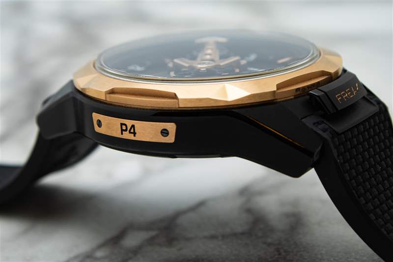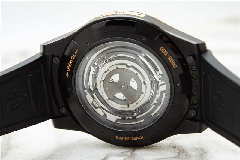 當(dāng)然,實(shí)際上 Freak ONE 并沒(méi)有什么平庸之處,仔細(xì)觀察紅金表圈就可以立即看出這一點(diǎn)。基于這種拉絲和拋光元件中尖銳的刻面圖案,這個(gè)表圈可能看起來(lái)不對(duì)齊,但這是 Freak ONE 獨(dú)特的上鏈和時(shí)間設(shè)置系統(tǒng)的唯一真正的視覺(jué)線索。翻轉(zhuǎn) 6 點(diǎn)鐘位置的“Freak”牌,旋轉(zhuǎn)表圈就會(huì)解鎖,但旋轉(zhuǎn)的不僅僅是表圈本身。扭轉(zhuǎn)這個(gè)雙向表圈還可以向前和向后調(diào)整時(shí)間設(shè)置,為佩戴者提供與 Freak ONE 啟動(dòng)對(duì)話的齒輪系的大規(guī)模觸覺(jué)連接。在背面,藍(lán)寶石顯示屏底蓋同樣非正統(tǒng)。通過(guò)逆時(shí)針旋轉(zhuǎn)底蓋外環(huán),佩戴者可以手動(dòng)為機(jī)芯上弦,盡管 Freak ONE 的創(chuàng)新上鏈系統(tǒng)使得這一點(diǎn)基本上沒(méi)有必要(稍后會(huì)詳細(xì)介紹)。雖然 Freak ONE 的外殼非常耐磨,而且充滿(mǎn)了有趣的花招,但它的致命弱點(diǎn)就是防水。這是該手表日常佩戴理念面臨的最大障礙,因?yàn)?30 米的深度等級(jí)讓 Freak ONE 根本無(wú)法勝任許多運(yùn)動(dòng)場(chǎng)合的任務(wù)。