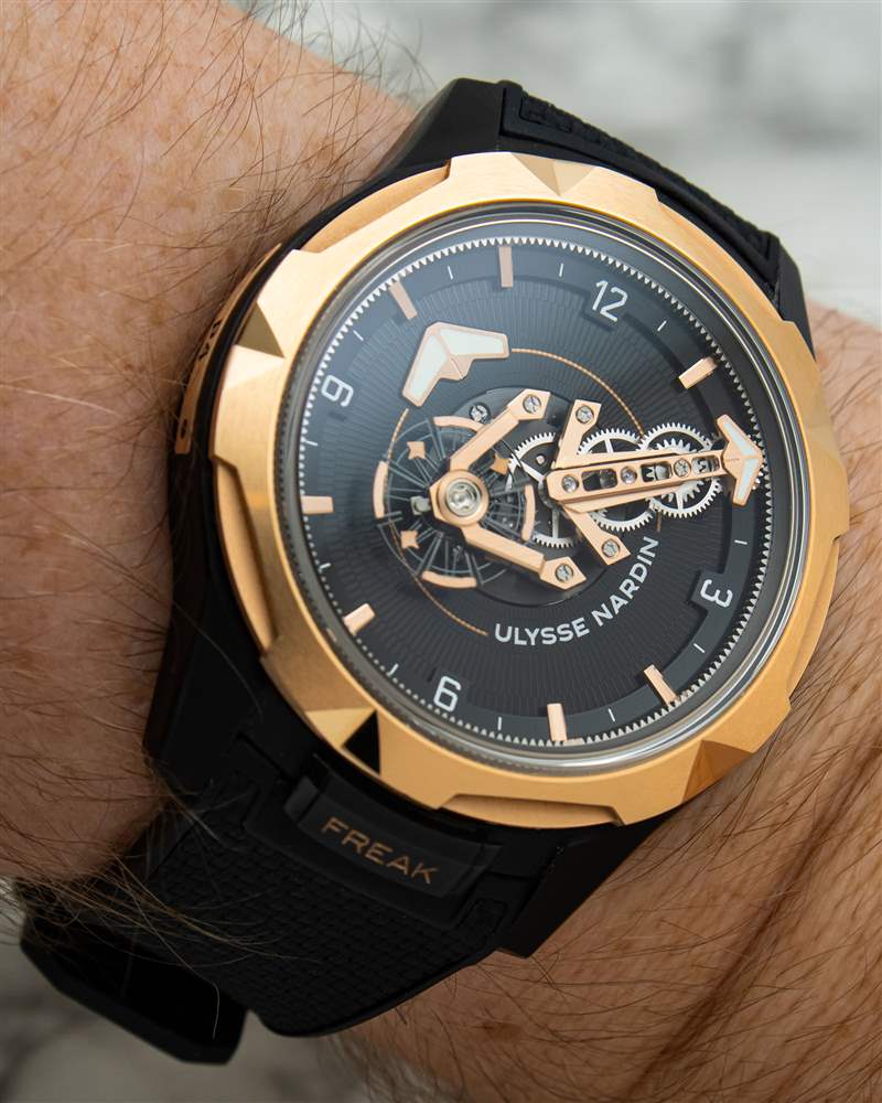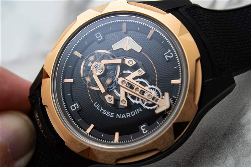 與表殼一樣,雅典表 Freak ONE 的鏤空表盤(pán)以之前的 Freak 型號(hào)為基礎(chǔ),但以更簡(jiǎn)潔、更精致的方式呈現(xiàn)了這些概念。嚴(yán)格來(lái)說(shuō),只有帶有淺色印刷阿拉伯?dāng)?shù)字和鑲貼金質(zhì)時(shí)標(biāo)的狹窄外圈是真正的表盤(pán)表面,藍(lán)寶石水晶下方的所有其他部件都是機(jī)芯部件。大部分空間被一個(gè)寬大的啞光黑色圓盤(pán)占據(jù),圓盤(pán)上有精致的脊?fàn)罴y理,并印有雅典表的文字標(biāo)志。由于此處采用寬大且?guī)в写罅恳构獾慕鹕切涡螤睿撔D(zhuǎn)圓盤(pán)可用作時(shí)針。然而,真正搶盡風(fēng)頭的是分針。這是 Freak 系列的標(biāo)志性碟形盤(pán),這是一個(gè)旋轉(zhuǎn)齒輪系組件,每小時(shí)在表盤(pán)上繞一圈,本質(zhì)上允許機(jī)芯,圍繞自身旋轉(zhuǎn)。與之前的 Freak 迭代相比,該組件在視覺(jué)上顯著簡(jiǎn)化,但 Ulysse Nardin 在形式上添加了對(duì)其自身傳統(tǒng)的厚顏無(wú)恥的認(rèn)可。包含齒輪系組件和分鐘標(biāo)記的主橋結(jié)構(gòu)也形成了該品牌的標(biāo)志性錨徽。錨標(biāo)志出現(xiàn)的唯一其他地方是表帶襯里,這使得這是一個(gè)令人印象深刻的克制品牌活動(dòng)。飛行擺輪橋作為分針的配重,與鏤空表盤(pán)表面上方的齒輪系一起旋轉(zhuǎn),成為動(dòng)態(tài)的視覺(jué)亮點(diǎn)。此外,由于擒縱機(jī)構(gòu)安裝在旋轉(zhuǎn)組件上,F(xiàn)reak ONE 在技術(shù)上還具備 60 分鐘陀飛輪復(fù)雜功能。這是最頑固的運(yùn)動(dòng)書(shū)呆子們的話題,