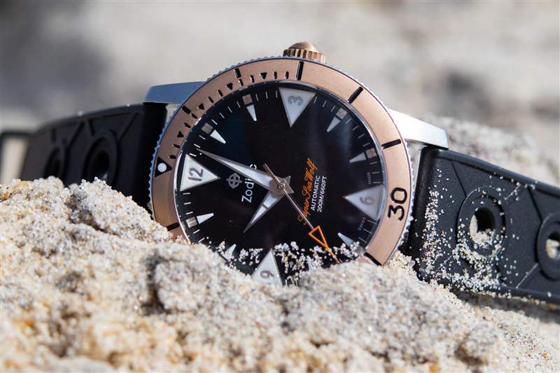 當我在前往海灘進行為期一周的旅行之前將最后的物品塞進車里時,一個盒子突然出現在我的家門口。我沒有看到送貨車接近、閑置或離開。盒子就放在那里,克服重重困難,在預計的交貨窗口最早結束時到達。可能性太小了,以至于我一開始都不知道包裹是什么。我必須把它撿起來,放在手里掂量,然后閱讀Zodiac的退貨地址,以確認手表確實在完美的時間到達,以至于需要重新配置我的假期陣容。我看到了在真正的海洋中佩戴潛水表的明顯機會;當然,我不能忽視命運,也不能帶上它。手表一到,事情就解決了:全新的 Zodiac X Huckberry Super Sea Wolf Bronze Skin Diver 已裝進我的包里,正在前往海灘的路上。